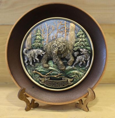 СУВЕНИРНАЯ ТАРЕЛКА МЕДВЕДЬ И СОБАКА ЦВЕТНАЯ. ОПТ